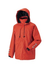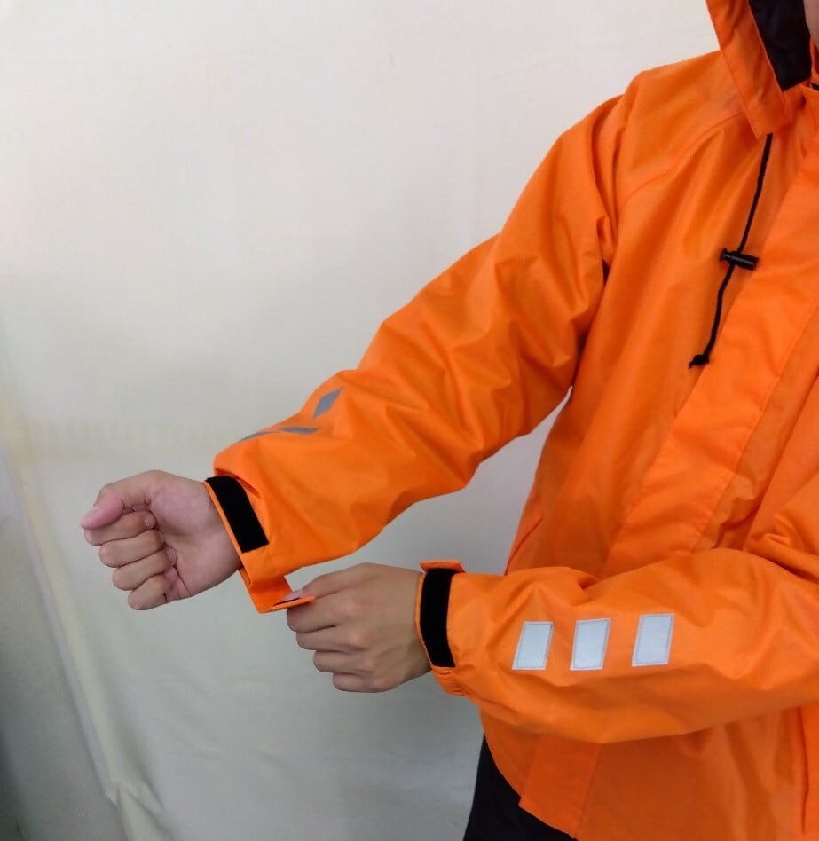 強力防水のレインジャケットに中綿を入れて防寒性もプラス!帽子(キャップタイプ)のつばが固定できるフードでめくれ防止。袖に反射プリント付。裾は紐で絞り調節可能。